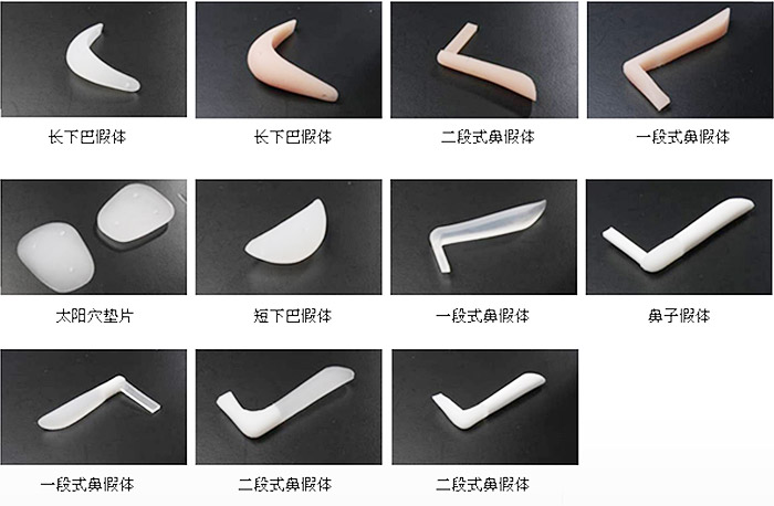 一段式隆鼻假体:相当于一个整体,包括鼻背、鼻头和鼻小柱三部分;不同颜色分类,适合不同皮肤求美者选择。