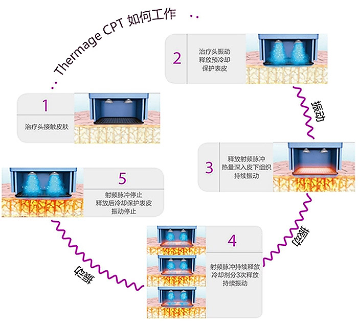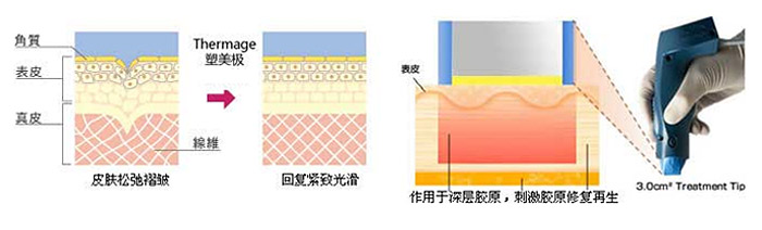 设备原理:利用专利性的治疗探头将高能量的高频电波传导至皮肤多层,以胶原蛋白收缩效应,造成立即性的皮肤紧实效果,并刺激新生皮肤中的胶原蛋白,以达到长效性的皮肤拉提与紧致的效果。