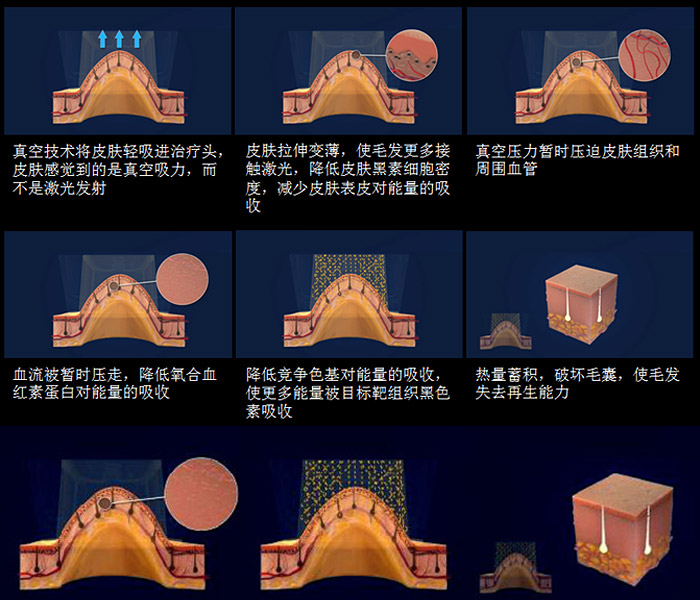 2、真空治疗技术,相对普通脱毛3-5痛感,真空脱毛仅为0-1,感觉非常轻微,颇为舒适。