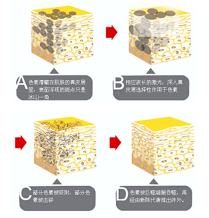 利用1064nm激光穿透性好的特点,使激光穿透皮肤,直达皮肤表皮基底层和真皮层,直接作用于病变组织,形成能量密度很高的巨脉冲,对黑色素细胞进行爆破。细胞被爆破后成为细小颗粒,被身体免疫细胞吞噬。Medlite C6激光系统采用选择性光热原理,不会对周围的正常组织造成伤害;其能量输出稳定,光斑均匀,使治疗时间大大缩短、治疗效果大大提高。