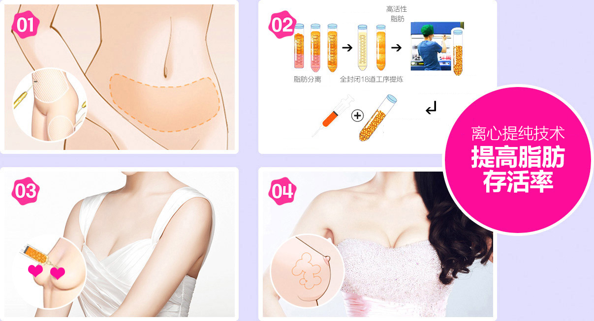 采用国际先进1-2mm超微创钝性吸脂针,网状分层均匀地抽吸腹部或大腿处深层多余脂肪,经由特殊处理制成高质量的活力脂肪颗粒,提高脂肪存活率,真实自然,动感与手感兼具。